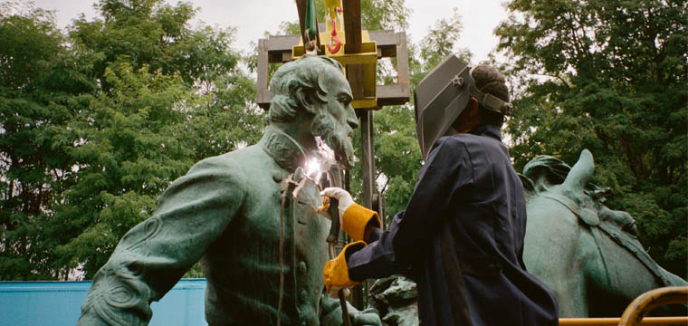 Co-organized and co-presented by MOCA and The Brick, MONUMENTS marks the recent wave of monument removals as a historic moment. The exhibition reflects on the histories and legacies of post-Civil War America as they continue to resonate today, bringing together a selection of decommissioned monuments, many of which are Confederate, with contemporary artworks borrowed and newly created for the occasion. Removed from their original outdoor public context, the monuments in the exhibition will be shown in their varying states of transformation, from unmarred to heavily vandalized.